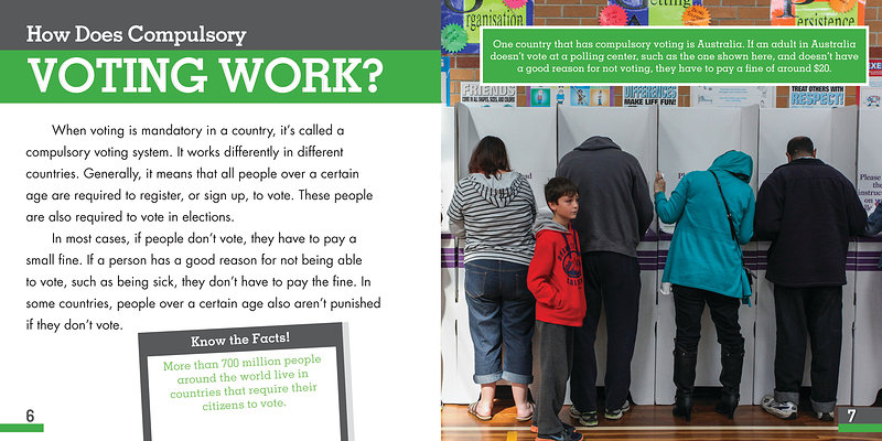 In some countries, citizens are required to vote in elections, but in the United States, citizens are free to choose not to vote. This had led to low voter turnout in many elections, and some people think making voting mandatory for American citizens would help the democratic process. Why do they believe this, and why do others strongly disagree with them? Readers explore these opposing points of view through unbiased main text, fact boxes, vibrant photographs, and a helpful graphic organizer. This creative look at democracy around the world encourages the development of informed opinions and critical-thinking skills.